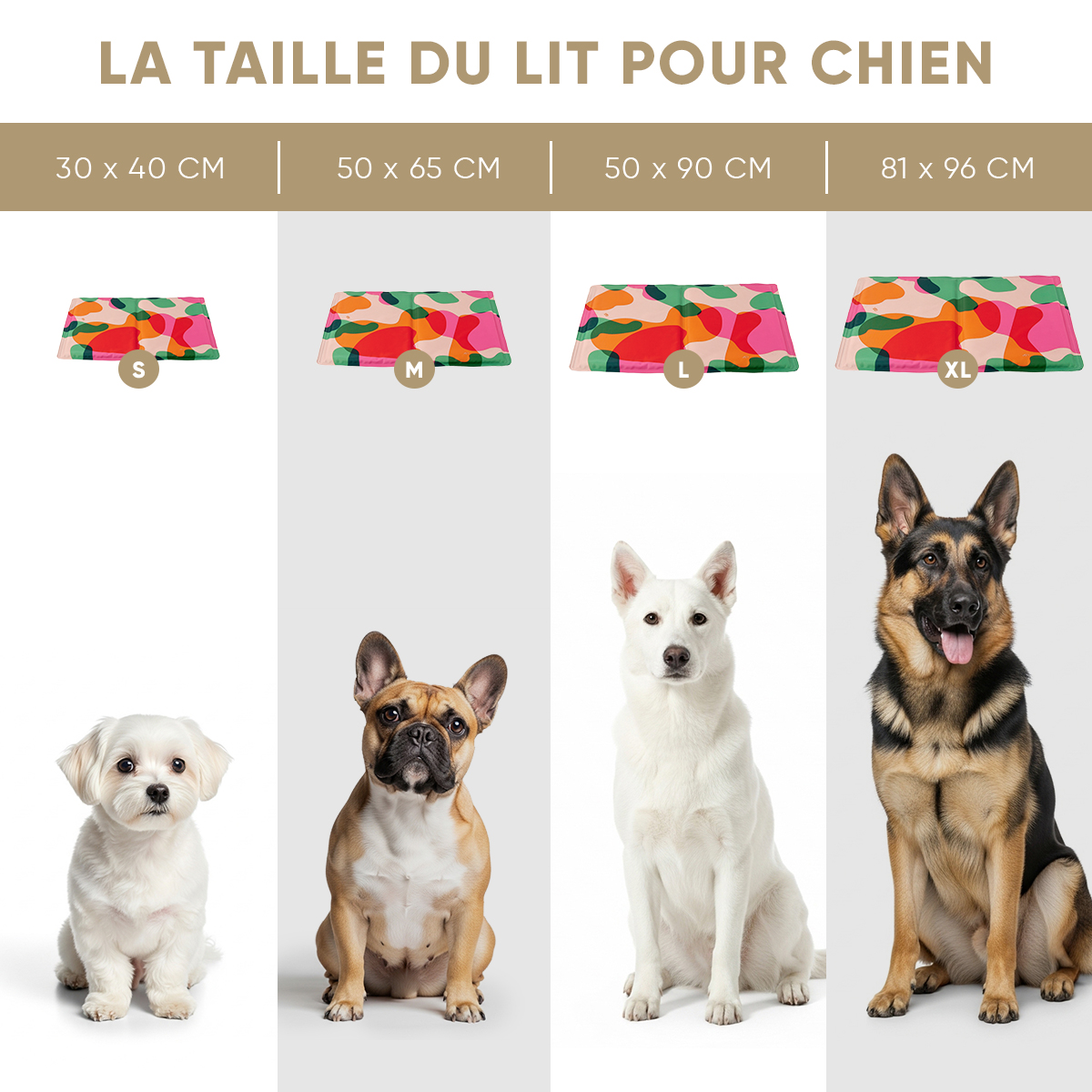 • Tailles : S: 60 x 40 cm | M: 80 x 50 cm | XL: 81 x 96 cm